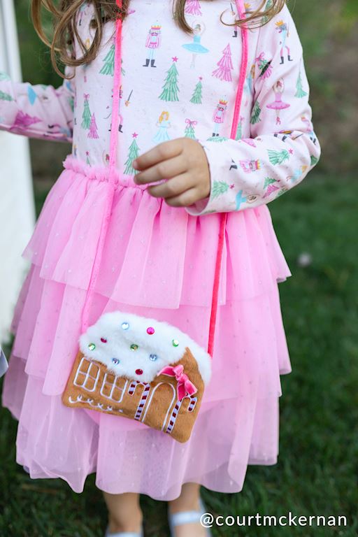 Delight in the whimsical charm of a of a light up Purse, a perfect accessory for the holiday season. This enchanting purse is crafted with a soft minky and faux fur exterior, offering a plush and cozy feel. The purse is adorned with twinkling LED lights that bring a magical glow to your ensemble, making it a standout piece for festive occasions. Designed with a luxurious velvet strap, it ensures comfortable wear for little ones and adults alike. The purse comes with a battery included, so it's ready to shine right out of the box. Suitable for ages 3 and up, this delightful accessory measures 5 1/2" x 5 3/4", making it the ideal size for carrying small treasures. The exterior is made from 100% polyester faux fur, while the interior is lined with 100% polyester, ensuring durability and easy maintenance. Add a touch of holiday spirit to your wardrobe with this charming Light-Up Gingerbread Purse.