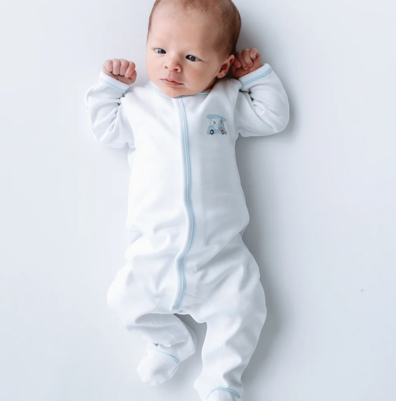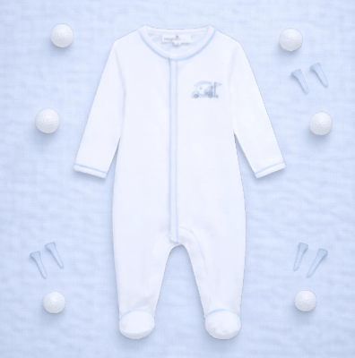 Keep him cozy with the refined lifestyle of golf. This Pima Cotton footie features light blue trim and signature hand-embroidery, providing the perfect balance of warmth and athletic sophistication for naptime and quiet afternoons. Designed for ultimate comfort, this one-piece essential ensures your little champion stays snug in the highest quality cotton available.