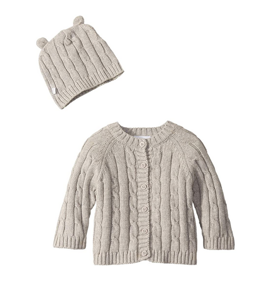 Thick, soft sweater in garter stitch has cable trim raglan sleeves and wood buttons. Hand-knit, in latte colored yarn, it is cozy and warm. The matching knit hat you see here is available separately. What a wonderful gift for any little person you know.