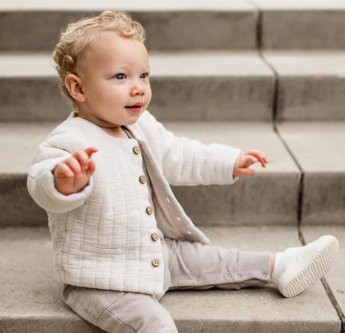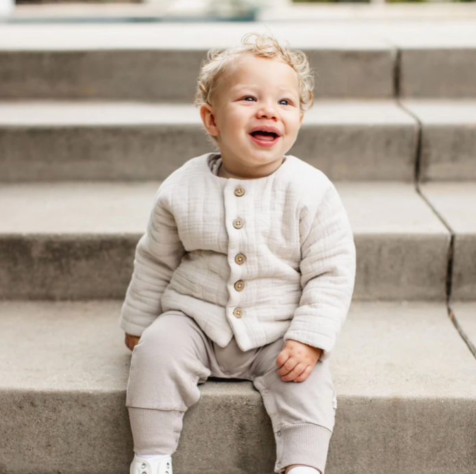 Our much loved organic cotton quilted jacket is back, this time without a hood. It's the easiest layering piece to every outfit.