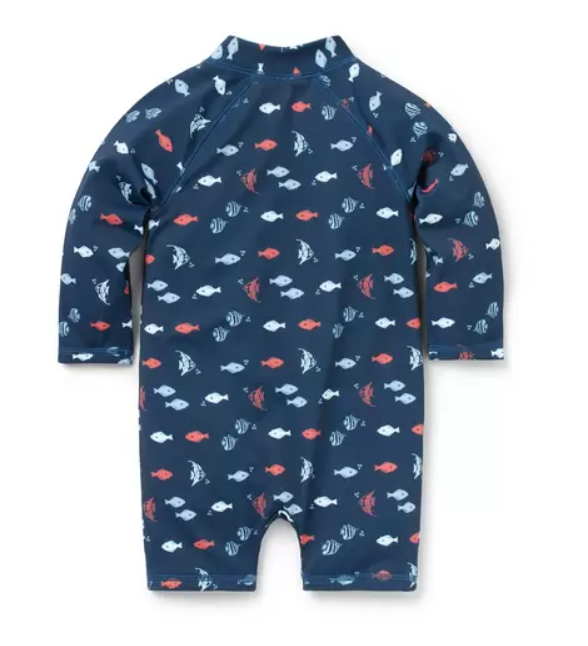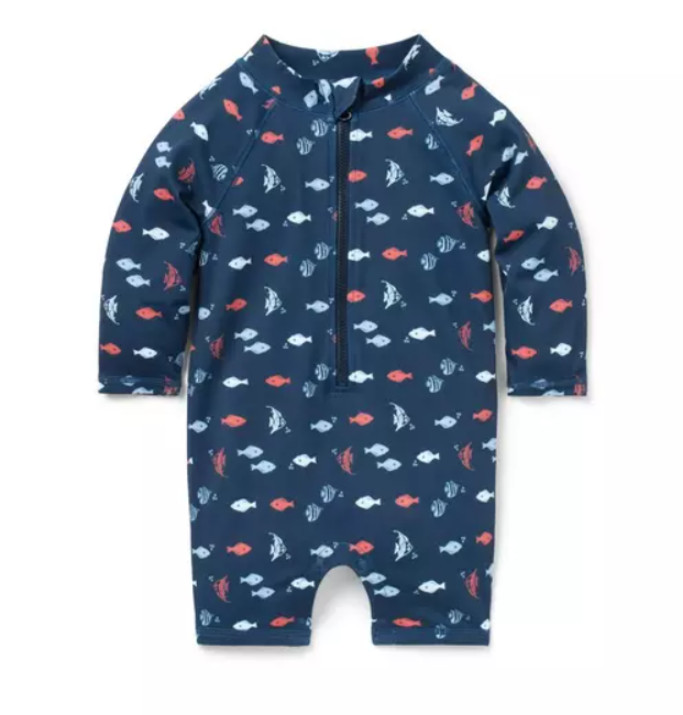 For first splashes, our rash guard swimsuit has baby covered. We love its allover fish friends print, raglan sleeves and UPF 50+ sun protection. Responsibly made with recycled polyester fabric.
