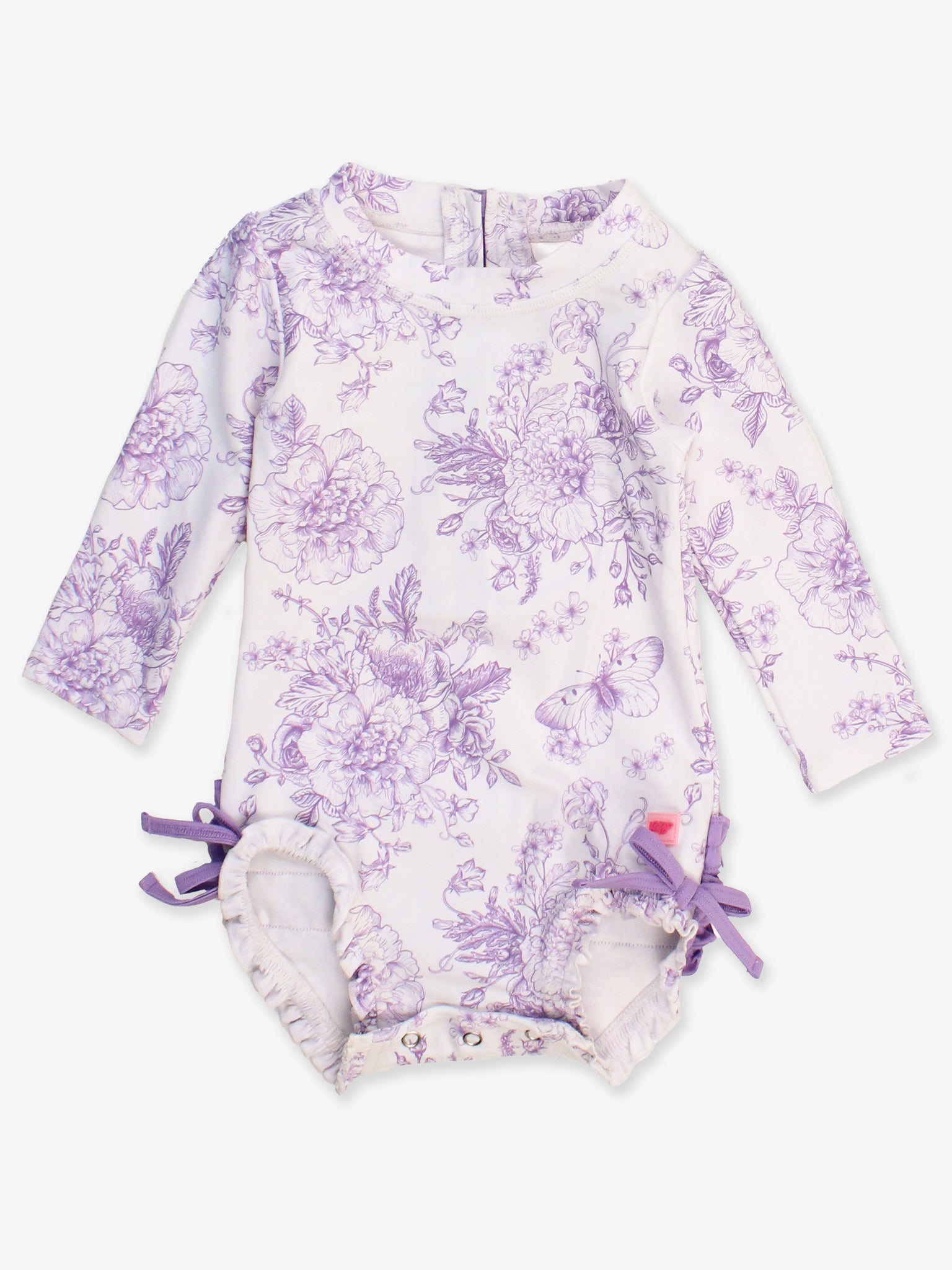 Wisteria Purple Butterfly Garden Toile Long Sleeve One Piece Rash Guard is the perfect choice for your little girl's beach adventures. Dressed in the delightful shade of wisteria purple, this one-piece rash guard features a charming butterfly garden print that adds a whimsical touch to her swimwear collection. Designed with long sleeves, it offers extensive coverage, making it ideal for playful days under the sun.