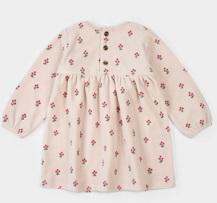 This velour dress set features our sweet Winterberry print and ruffle detailing. A button placket at the back makes the dress easy to pull over her head while keeping the front looking neat and chic. The dress comes with coordinating ribbed tights for a cozy, festive look that’s perfect for family gatherings.