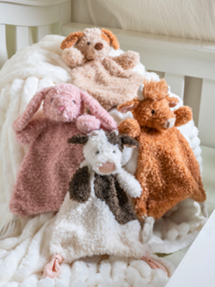 Each 11″ lovey features a sweet stuffed animal character head perched on one corner of a cuddly, blanket-like body. The lightly lined, bean-free design is perfect for little hands to grasp and snuggle. Subtle, timeless colors ensure these loveys grow with your child without feeling babyish.